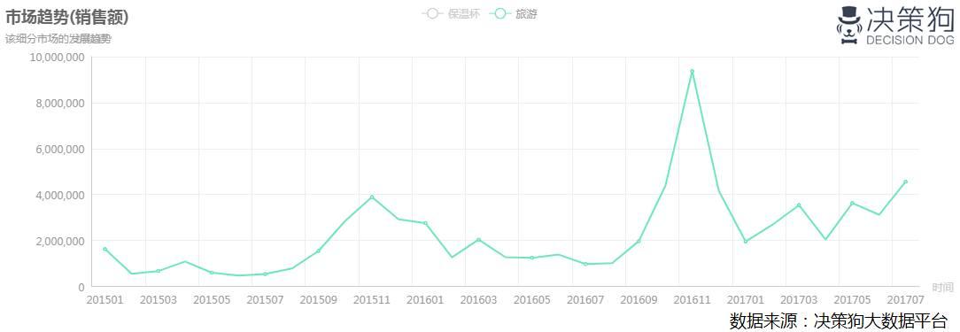决策狗数据显示,保温杯线上市场最近12个月总销售额(淘宝天猫)约28.5亿元,市场需求大。其中旅游保温杯最近12个月总销售额(淘宝天猫)约4.4千万元,旅游保温杯2017年7月销售额约5百万元,占整个保温杯市场的3%左右。